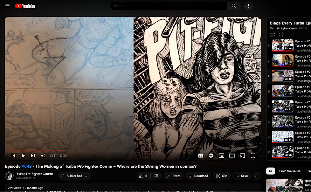 I’m thrilled to return to comics, with inker and co-host Kurt Brugel, weaving an imaginative world of art and writing with the production of our sci-fi comic Turbo Pit-Fighter, streamed live every Sunday at 10am EST on the Making Turbo Pit-Fighter channel. What’s different about us? We pencil and ink live in split-screen as we refine the plot, sequencing, dialog and lettering as we have fun discussing comics, art techniques and comic culture from the perspective of two art teachers. So there’s a podcast besides the comic being made.
